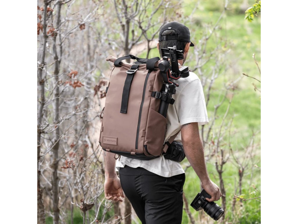 Konštrukcia z vodeodolného tarpaulinového materiálu a balistického nylonu chráni obsah aj v náročných podmienkach. Batoh disponuje polstrovanou priehradkou na notebook so zavesenou konštrukciou, bočným prístupom do hlavného priestoru, vrchným rýchlo prístupným vreckom a rolovacím uzáverom na flexibilnú zmenu objemu. Skryté vrecko na pas zvyšuje bezpečnosť, vonkajšie vrecko na fľašu alebo statív s cinch popruhom a priechod na batožinu uľahčujú cestovanie.