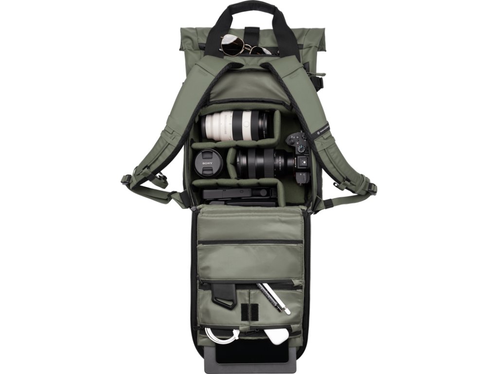 Batoh je vyrobený z plachty odolnej voči poveternostným vplyvom a balistického nylonu. Tvarovaný chrbtový panel a polstrované ramenné popruhy zaručujú komfort pri nosení. Medzi výbavu patrí bočný prístup do priehradky na fotoaparát, čalúnené puzdro na notebook s ochranou falošného dna, rozšíriteľný rolovací vrch a skryté vrecko na pas. Essential Camera Cube (15 l) s nastaviteľnými priehradkami udrží vašu foto zostavu prehľadnú a chránenú, zatiaľ čo vonkajšie body slúžia na nosenie statívu alebo fľaše s vodou.