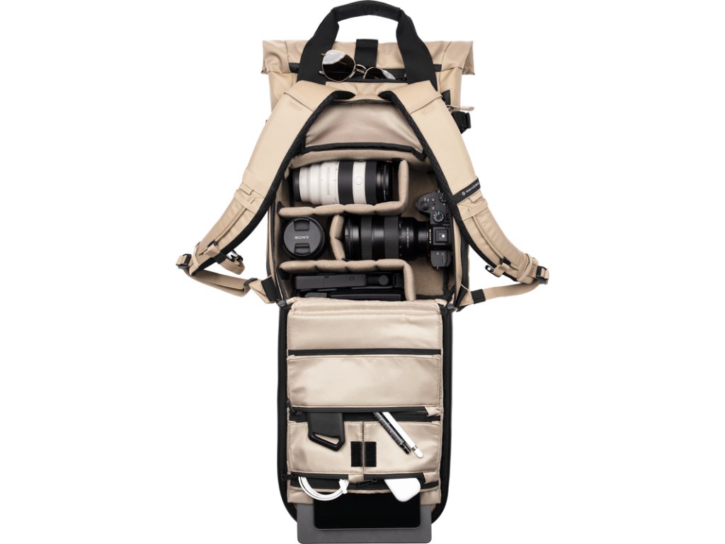 Odolné materiály (plachta a balistický nylon) chránia výbavu pred dažďom aj náročným používaním. Tvarovaný chrbtový panel a polstrované ramenné popruhy sa starajú o pohodlie. Bočný prístup k priehradke na fotoaparát umožňuje rýchlo reagovať na situácie, čalúnené puzdro na notebook s falošným dnom chráni elektroniku, rozšíriteľné rolovacie veko poskytuje extra objem a skryté vrecko na pas zvyšuje bezpečnosť pri cestovaní. Essential Camera Cube (15 l) s nastaviteľnými priehradkami pomáha udržať fotovýbavu prehľadnú, zatiaľ čo externé body umožňujú pripevniť statív alebo fľašu.