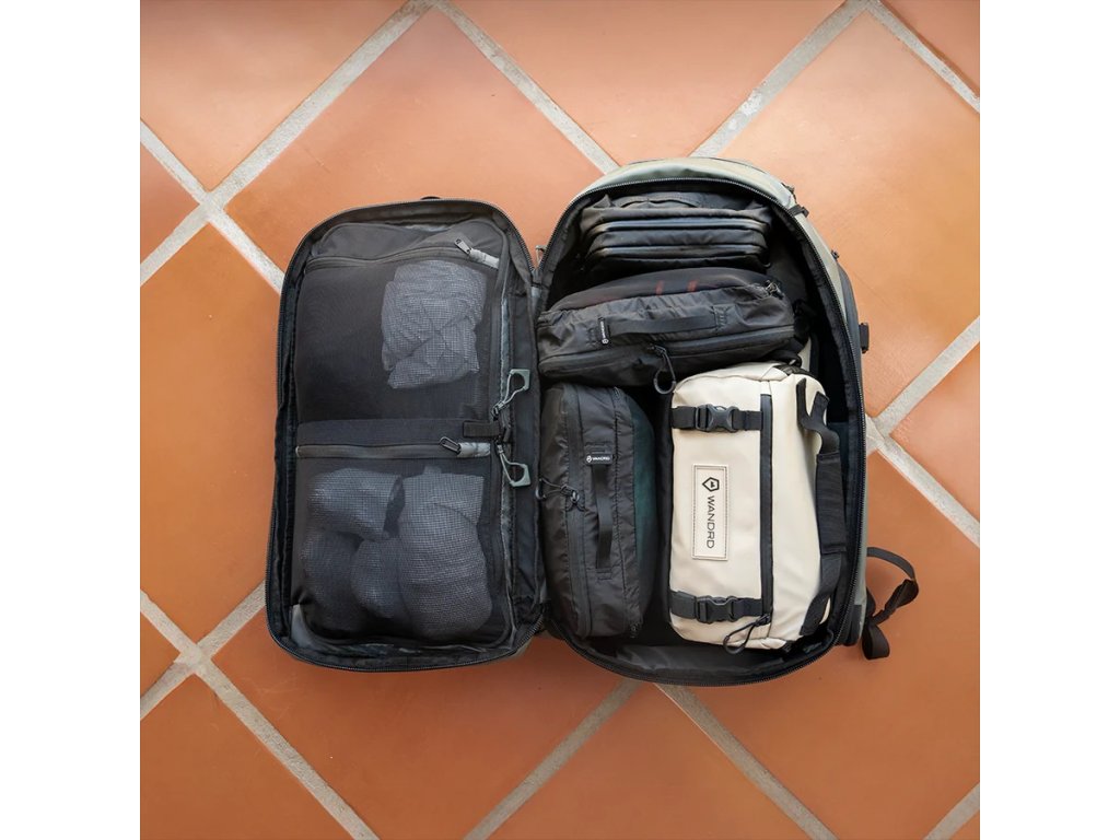 Batoh ponúka kufrové otváranie s vnútornou kompresiou, oddelené polstrované priehradky na notebook a tablet a množstvo vreciek na drobné príslušenstvo. Vďaka kompatibilite s kamerovými kockami WANDRD ho ľahko premeníte na fotobatoh. V balení nájdete vrecko na bielizeň, vrecká na obuv a ďalšie doplnky uľahčujúce cestovanie.
