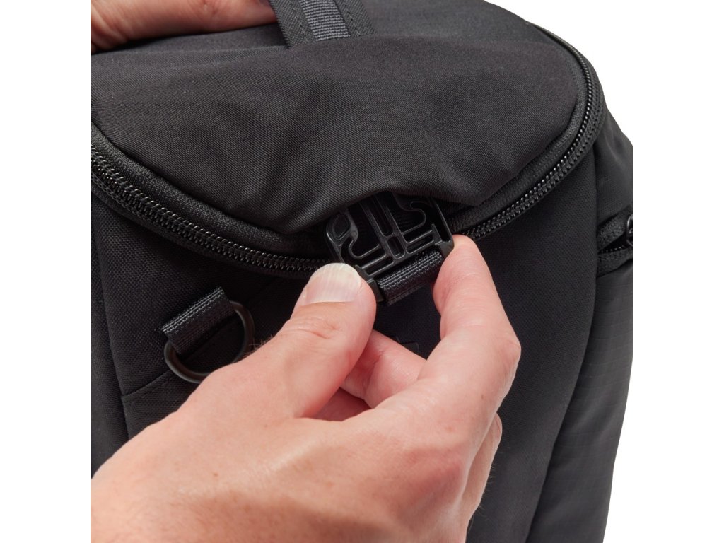Rýchloupínacia pracka zabezpečuje okamžitý prístup, zatiaľ čo vnútorná prepážka udrží fotoaparát vo vrchnej časti pre jednoduché vybratie alebo rozdelí tašku na priestor pre dve menšie sklá.