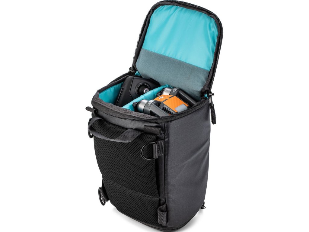 Brašna Top Loader je vhodná pre telo fotoaparátu do veľkosti Canon 5D/Nikon D850 s nasadeným objektívom 24-70 mm 2,8. Po rozopnutí rozšíriteľného dna sa doň zmestí nasadený objektív 70-200 mm 2,8. Okrem toho je brašna vybavená vertikálnou prepážkou, ktorá umožňuje vytvoriť dokonalý priestor pre dron Mavic, ovládač a príslušenstvo.