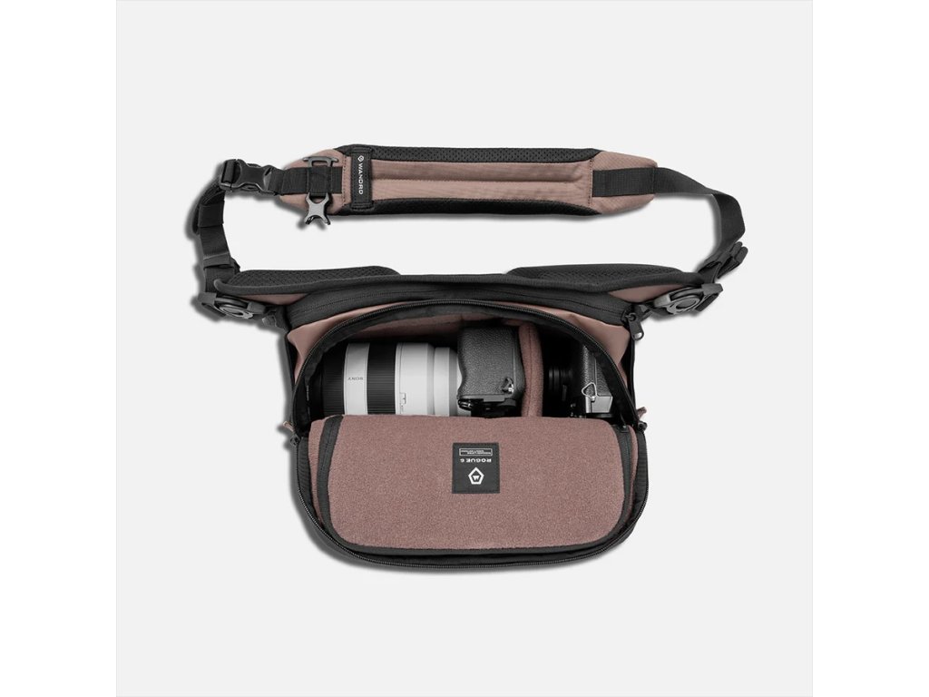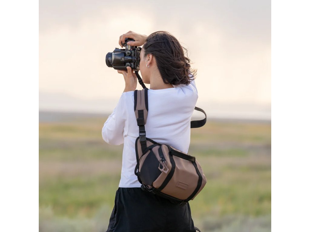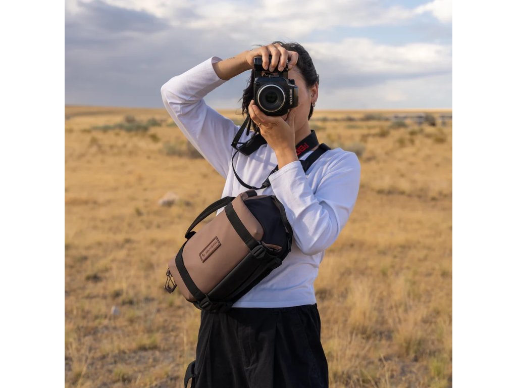 ROGUE Sling 6 l v farbe Atacama Clay ponúka vyváženie medzi kompaktnosťou a kapacitou. Je navrhnutá tak, aby pojala fotoaparát, ďalšie objektívy a potrebné príslušenstvo, pričom zachováva štíhly profil a vysokú mobilitu.
