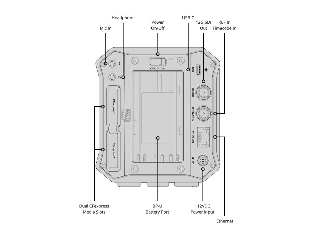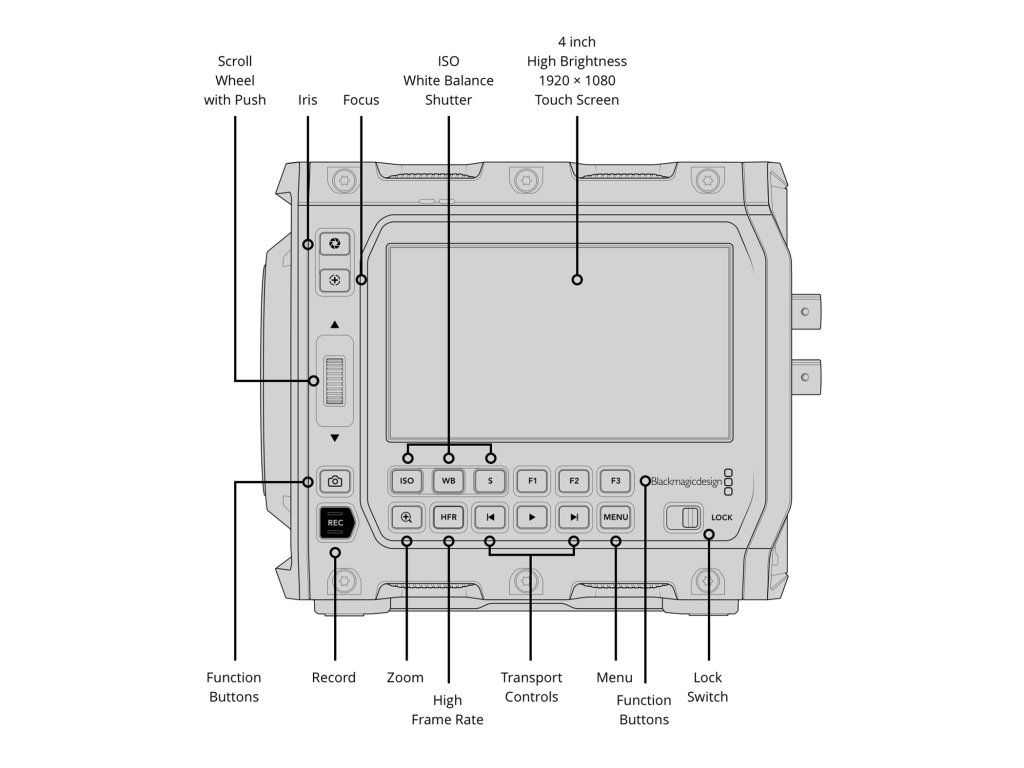 Kamera je vybavená 4" dotykovým LCD displejom s rozlíšením 1920 × 1080 a jasom 1500 nitov. Ovládanie prebieha cez dotykové menu a fyzické tlačidlá vrátane ISO, White Balance, Shutter, IRIS, Focus a ďalších funkcií.