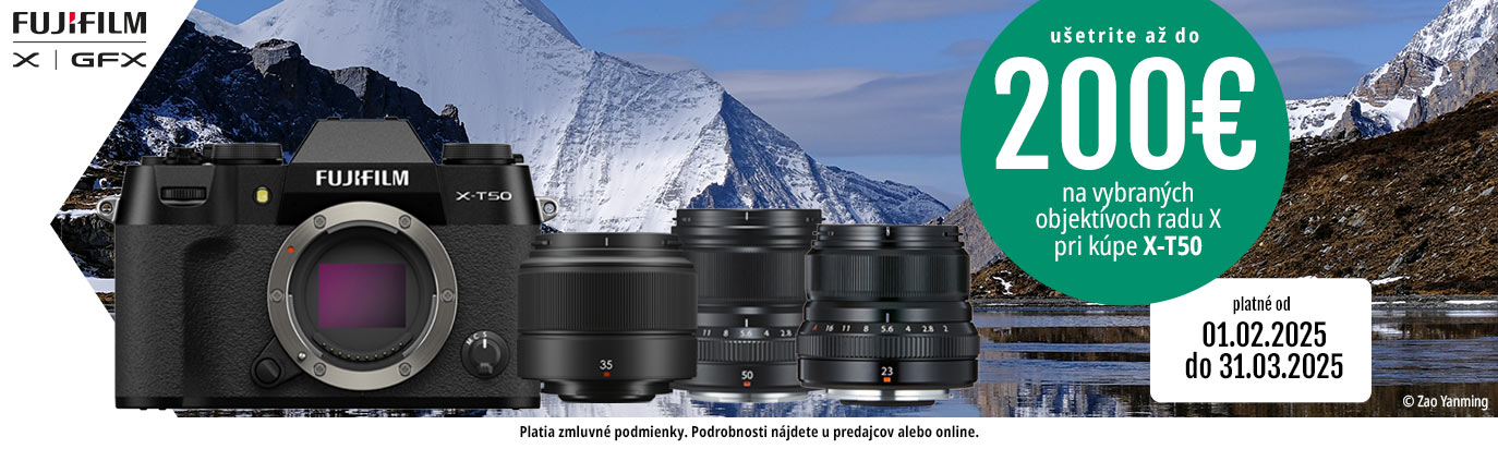 Využi výhodnú akciu a ušetri! Kúp si fotoaparát rady X-T50 (telo alebo kit) spolu s niektorým z vybraných objektívov a ušetri až do 200 €.