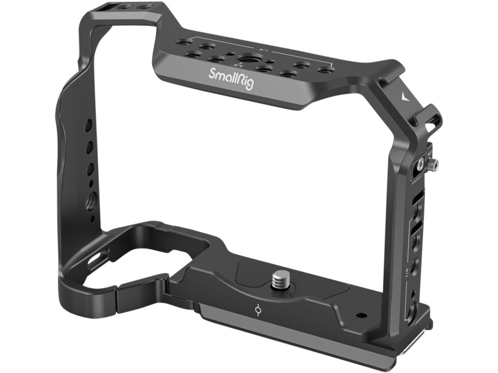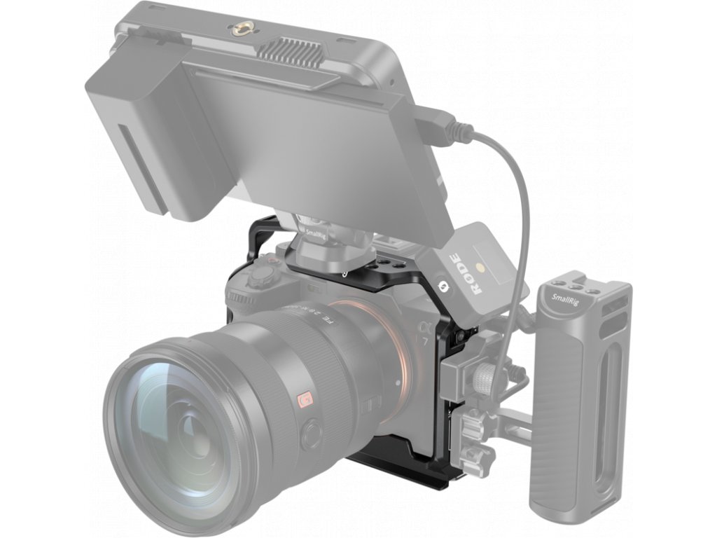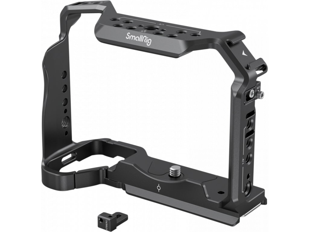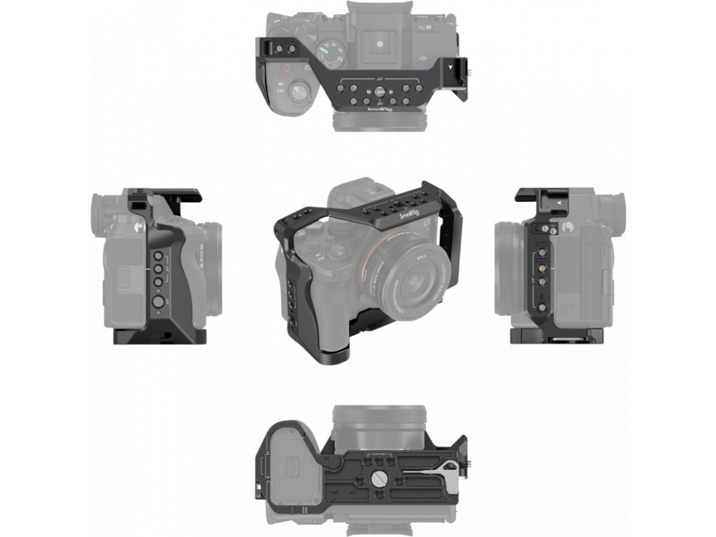 Otvory na bočných stranách a spodnej časti klietky umožňujú pripevnenie takéhoto príslušenstva, ako je ručný popruh SmallRig 2456 a ramenný popruh 2428. Okrem toho sa klietka dodáva so zabudovaným magnetickým kľúčom, ktorý uľahčuje demontáž a montáž. Svorka na káble HDMI 3000 nie je kompatibilná s Alpha 1. Ak chcete použiť bočný zámok, najprv odstráňte deliaci krúžok na ľavej strane fotoaparátu.