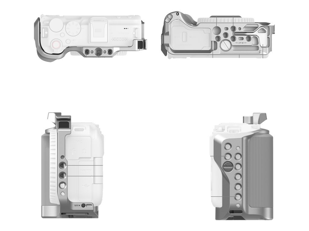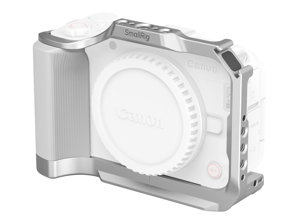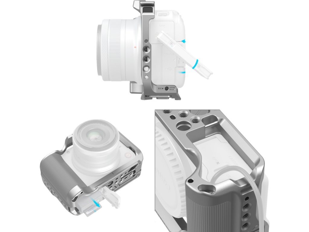 Presne tvarovaná klietka z hliníkovej zliatiny rozširuje možnosti upevnenia príslušenstva k fotoaparátu Canon EOS R50 V bez obmedzenia prístupu k ovládacím prvkom či portom. Vnútorné silikónové podložky bránia poškriabaniu a dvojbodové uchytenie cez skrutky 1/4"-20 (spodná a bočná) zabezpečuje pevné spojenie bez vychýlenia.