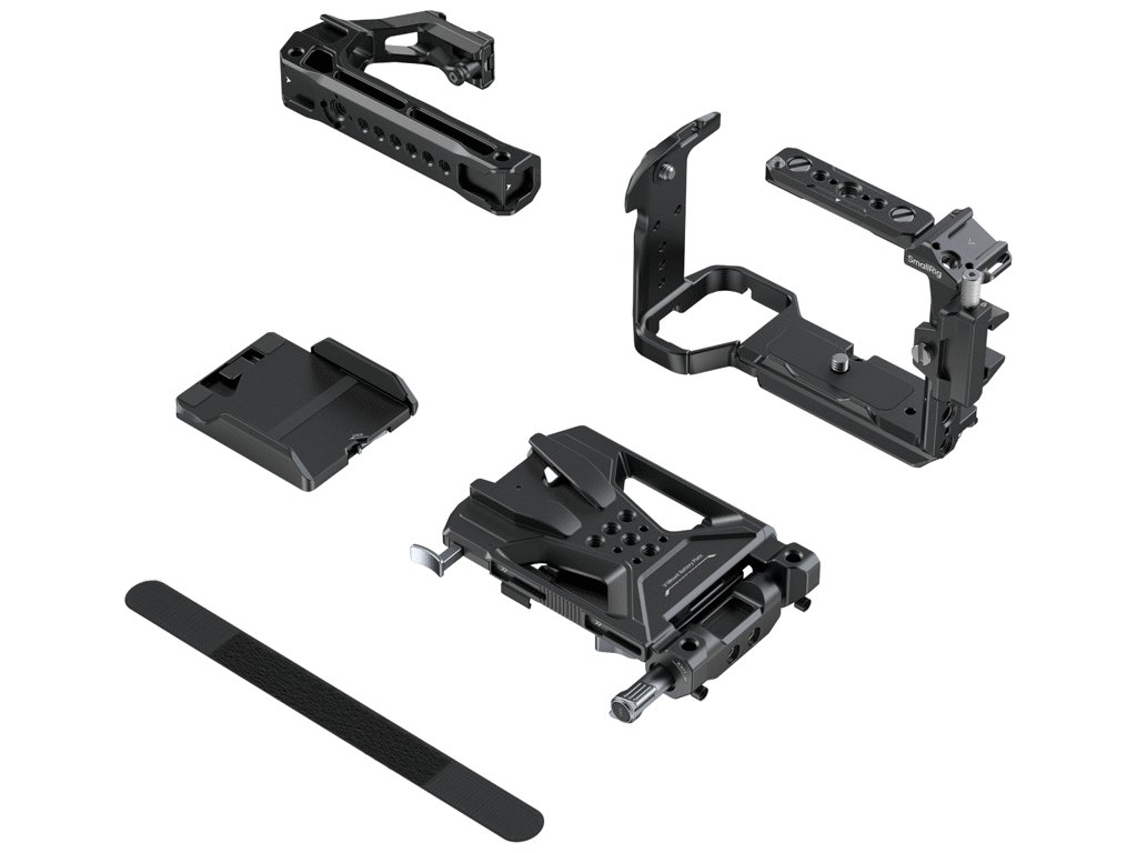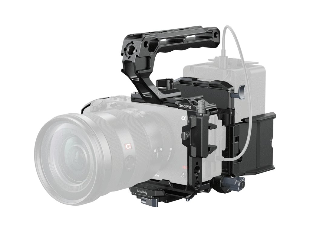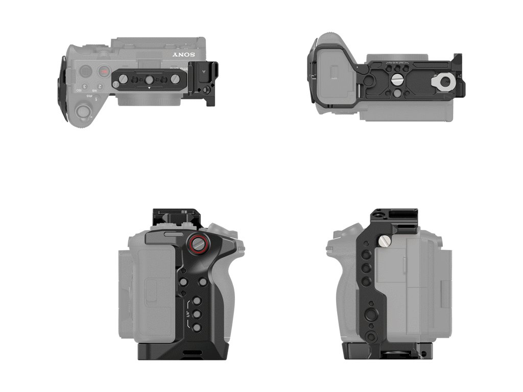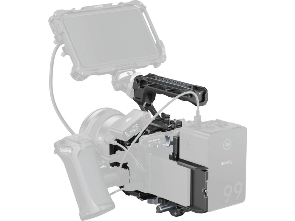 Integrovaná rýchloupínacia doštička Arca‑Swiss na spodku uľahčuje rýchle striedanie medzi statívom typu Arca a gimbalmi DJI RS 2, RSC 2, RS 3, RS 3 Pro, RS 4 a RS 4 Pro. Základňa so zásuvkou QD umožňuje pripojenie ramenného popruhu, pričom magnetický plochý kľúč zjednodušuje montáž. Súčasťou je aj ergonomická horná rukoväť s protišmykovým silikónovým povrchom a svorka HDMI pre bezpečné vedenie kábla. Horná modulárna NATO koľajnica je kompatibilná s hornými rukoväťami NATO a držiakmi monitorov SmallRig alebo sa dá odstrániť pre použitie originálnej XLR rukoväte Sony.