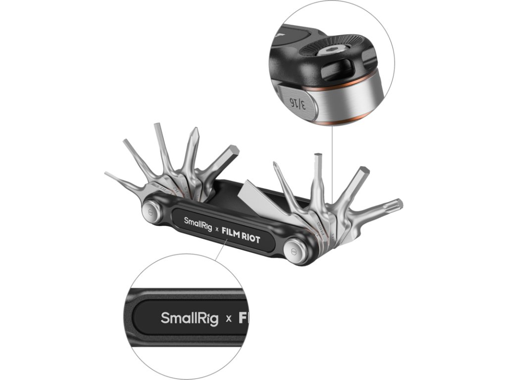 Zelená verzia 10 v 1 skladacej sady kľúčov ponúka plnú škálu nástrojov pre zostavovanie a servis filmárskych rigov. Možnosť zaistiť kľúče v dvoch pevných polohách výrazne uľahčuje dotiahnutie skrutiek na ťažko dostupných miestach.
