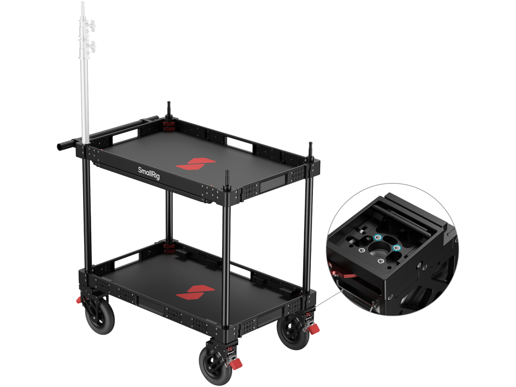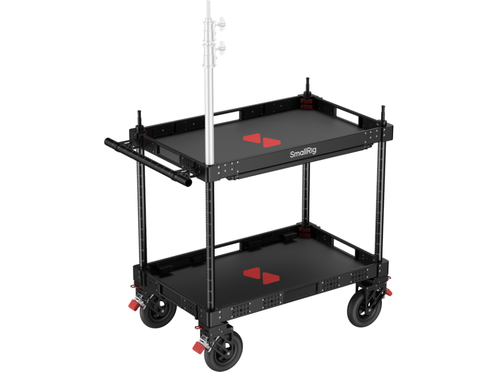 Skladacia konštrukcia sa dá zložiť na výšku len 17,2 cm na jednoduchú prepravu, takže je rovnako vhodný do mestských štúdií aj na vzdialené natáčanie. Vďaka dvojúrovňovej konštrukcii platformy poskytuje horné poschodie viacero montážnych bodov na pripojenie monitorov, notebookov, bezdrôtových vysielačov a napájacích systémov, zatiaľ čo spodné poschodie bezpečne pojme objemné zariadenia. Vozíček poskytuje výnimočnú stabilitu a bezpečne prenáša vaše zariadenia počas pohybu.