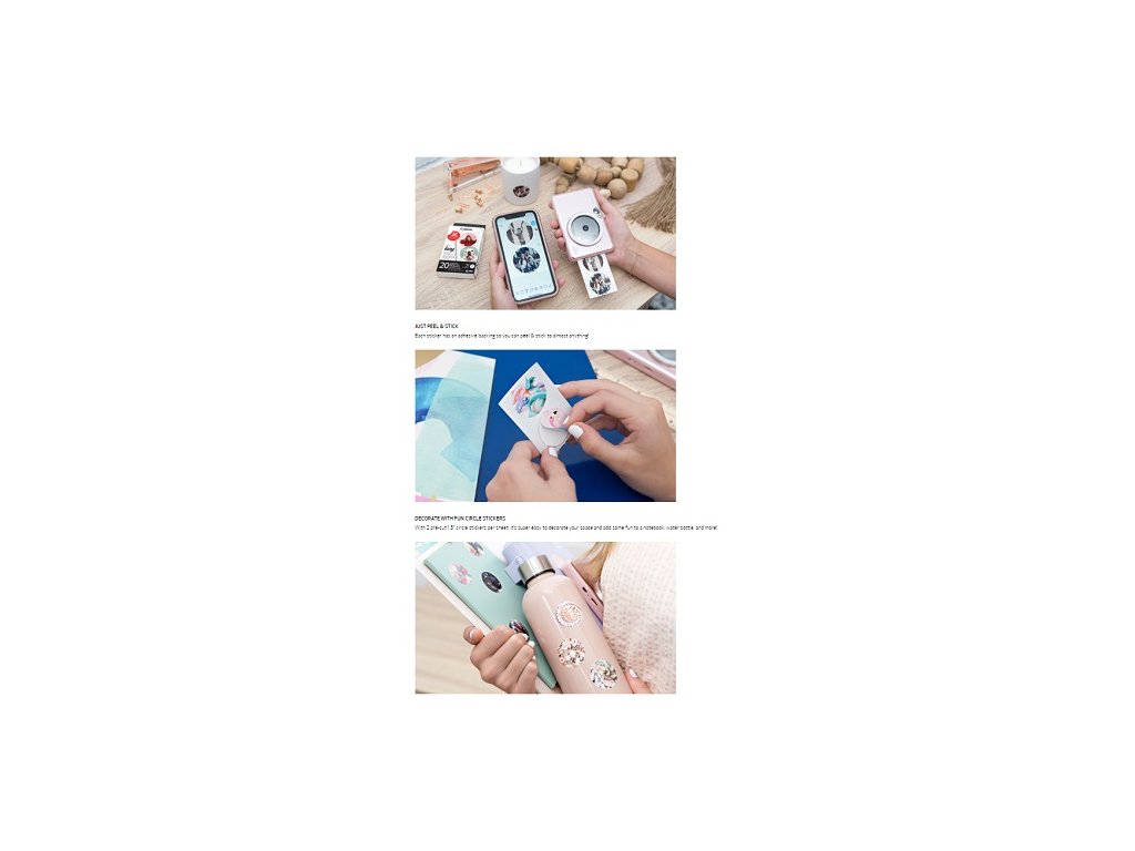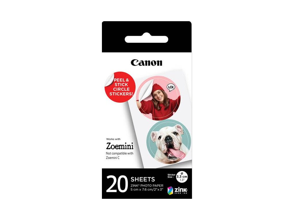 Neobmedzujte sa v tlači vašich fotografií prostredníctvom termosublimačnej mini tlačiarne Canon Zoemini alebo priamo z instantného fotoaparátu Canon Zoemini S a S2. Užite si vaše snímky tu a teraz vďaka fotopapieru Canon ZINK ZP-2030-2C. V balení sa ukrýva 20 hárkov, každý s dvoma predrezanými kruhovými samolepkami s priemerom 33 mm. Originálna nálepka zachytávajúca jedinečný okamih sa razom stane spomienkovým predmetom, ktorým odlíšite svoje osobné veci od ostatných. Stačí iba odlepiť papierovú zadnú stranu a umiestniť ju na požadované miesto. Samolepky vytlačené na fotopapier Canon ZINK ZP-2030-2C sú odolné voči roztrhnutiu, vode aj rozmazaniu. Na tlač nie je vyžadovaný atrament. Papier je pokrytý mikrokryštálmi, ktoré reagujú pri zahriatí.