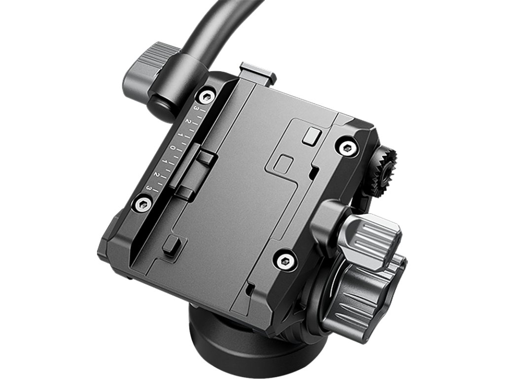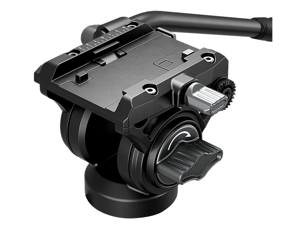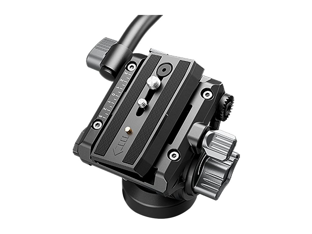 Fluidný systém zabezpečuje jemne tlmené pohyby bez trhania a samostatné zámky pre pan a tilt umožňujú presnú kontrolu nad kompozíciou. Rýchloupínacia doska uľahčuje nasadenie a vyváženie kamery.