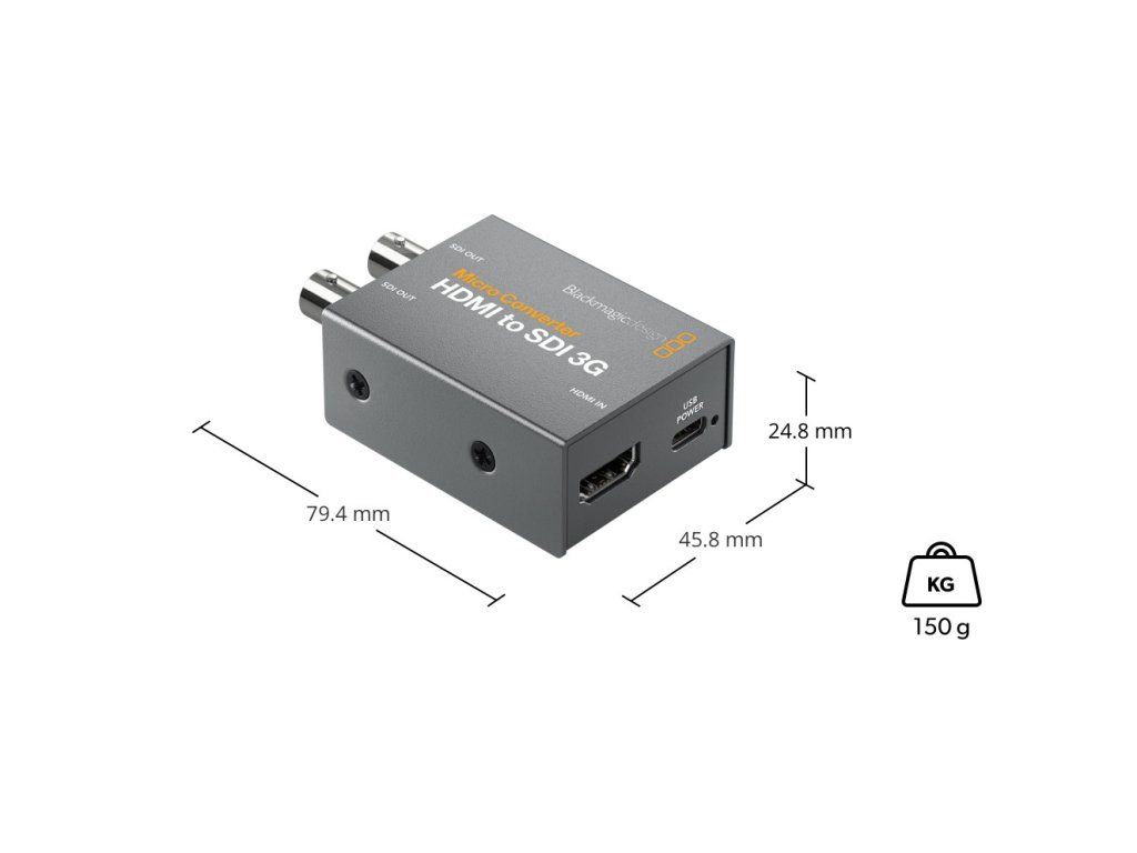 Blackmagic Micro Converter HDMI to SDI 3G je kompaktný broadcastový prevodník navrhnutý na spoľahlivý prenos HDMI signálu do profesionálneho SDI prostredia. Predstavuje praktické riešenie pre pripojenie kamier, notebookov alebo iných HDMI zariadení k SDI monitorom, rekordérom, switcherom a ďalšej broadcast technike.