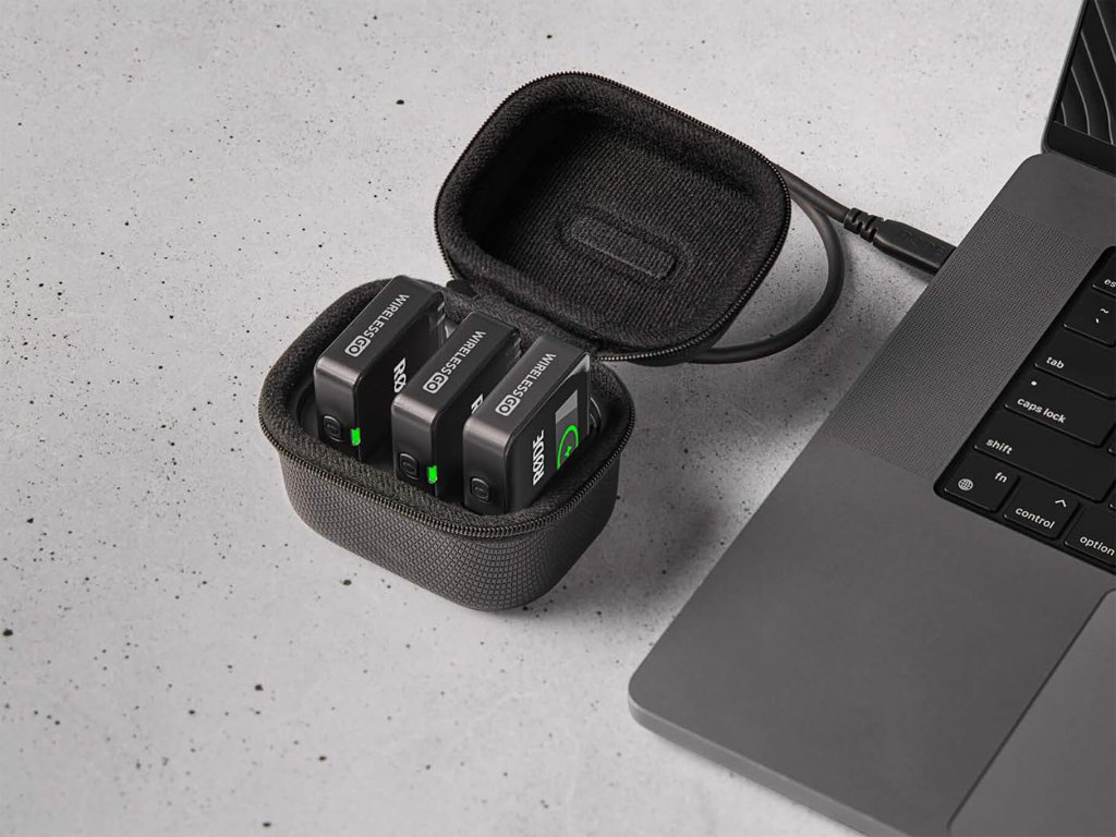 Vďaka integrovanej batérii s kapacitou 4200 mAh dokáže dvakrát plne dobiť celý set, čím predlžuje celkovú prevádzku až na približne 21 hodín. Port USB‑C poskytuje nielen nabíjanie samotného puzdra, ale aj prístup k dátam zariadení pre prenos záznamov a nastavenie v aplikácii RØDE Central.