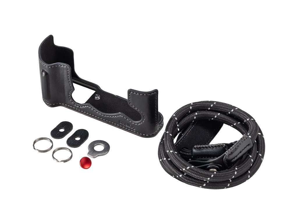 Všetky ovládacie prvky, porty, batériová priehradka a slot na kartu zostávajú plne dostupné. Skrutka s palcom na spodnej strane integruje závit 1/4"-20, čo umožňuje priamu montáž na statív. Súprava obsahuje aj ladený tkaný ramenný popruh a dedikovanú krytku tlačidla spúšte pre lepšiu hmatovú spätnú väzbu.