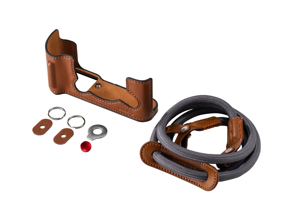 Všetky ovládacie prvky, porty, batériová priehradka a slot na kartu zostávajú plne dostupné. Skrutka s palcom na spodnej strane integruje závit 1/4"-20, čo umožňuje priamu montáž na statív. Súprava obsahuje aj ladený tkaný ramenný popruh a dedikovanú krytku tlačidla spúšte pre lepšiu hmatovú spätnú väzbu.