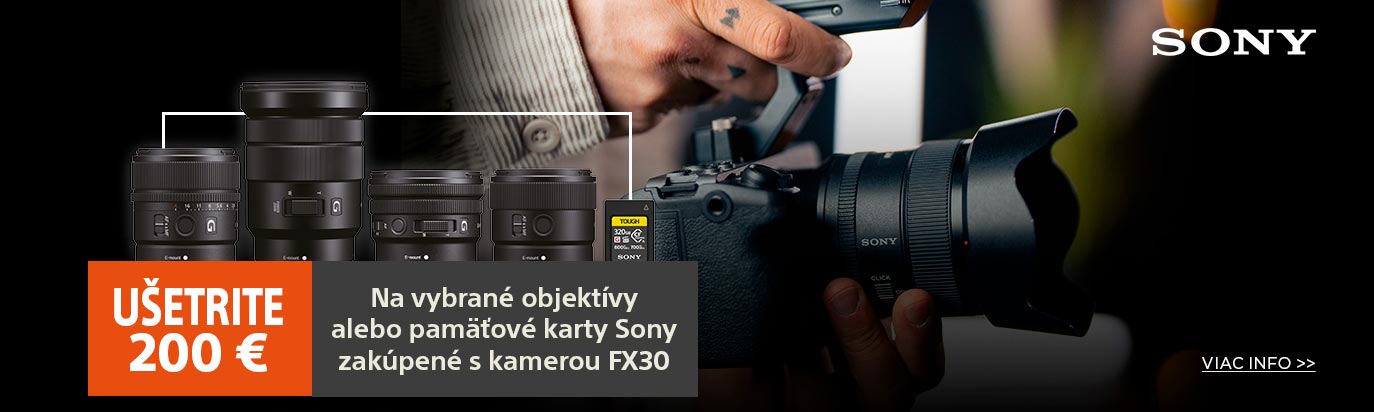 Kúp si Sony FX30 alebo Sony FX30 s XLR handle v období od 1. 5. 2023 do 30. 6. 2023 a získaj ďalších 200 € na nákup niektorého z vybraných objektívov, alebo karty CEAG320T.