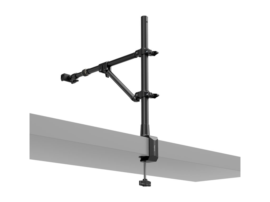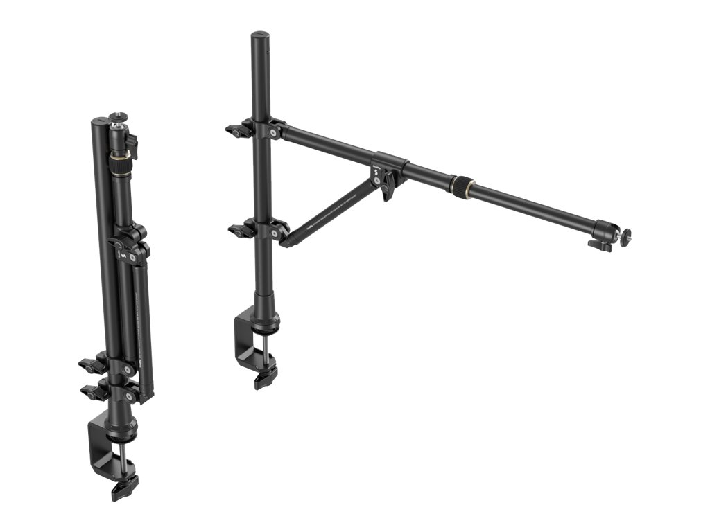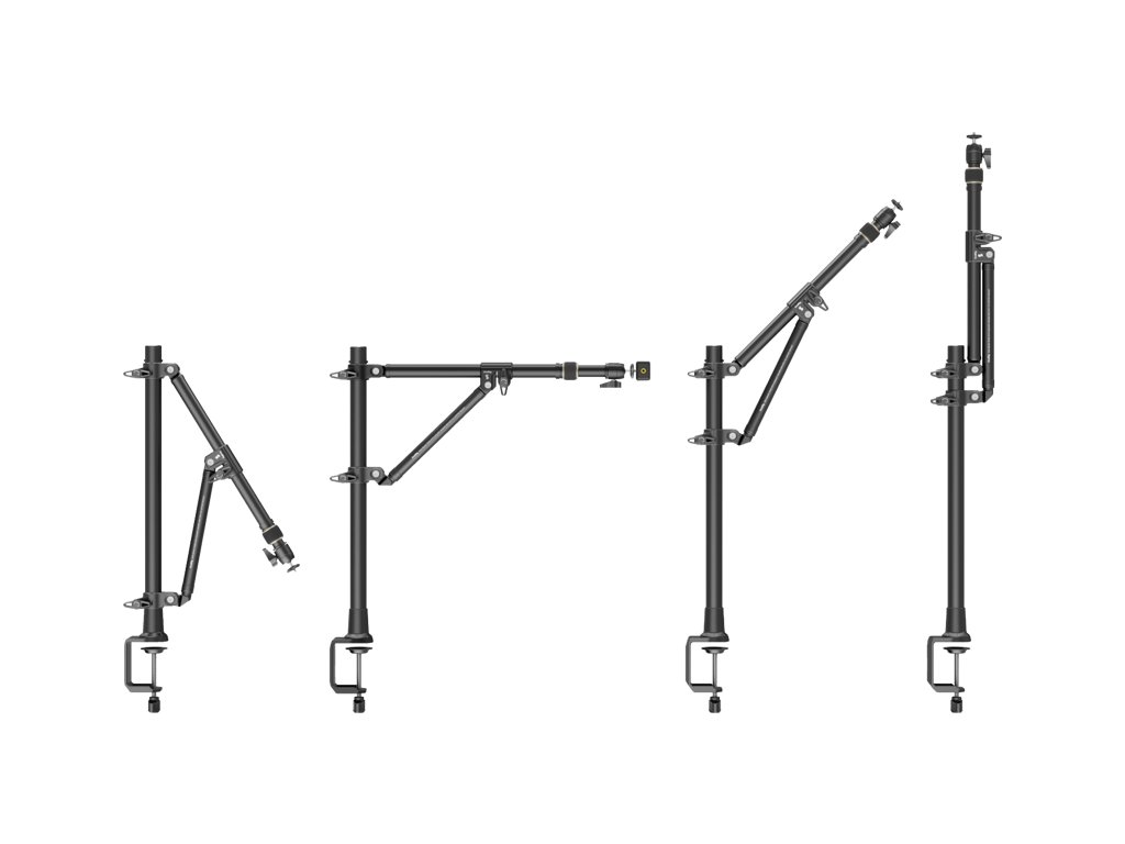 Stolový držiak je navrhnutý na snímanie zhora nad pracovnou plochou a na profesionálne live streamy. Robustný stredový stĺpik unesie až 3 kg a výložníkové rameno s nastaviteľnou dĺžkou umožňuje ideálne umiestnenie fotoaparátu, telefónu alebo webkamery nad stolom.