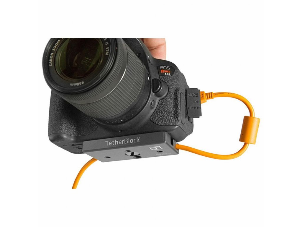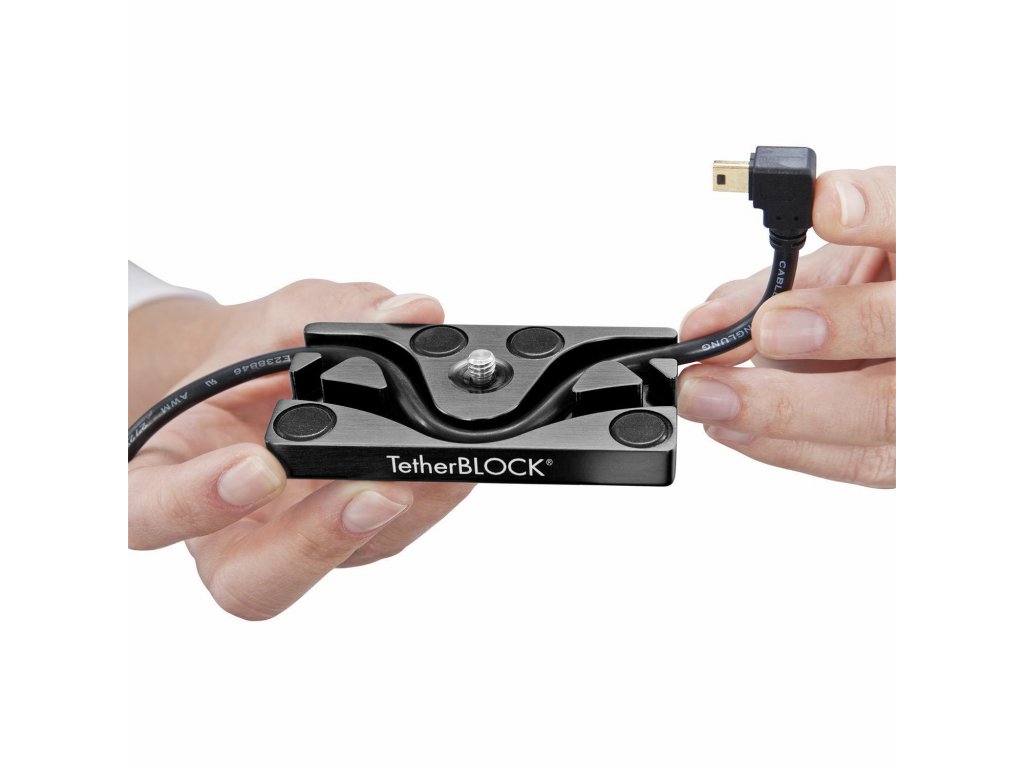 TetherBlock je navrhnutý tak, aby zabránil náhodnému vytiahnutiu kábla z dátových portov fotoaparátu tým, že pretiahne kábel USB, FireWire alebo HDMI cez jeden z troch kanálov TetherBlocku. Doska sa k fotoaparátu pripevňuje pomocou skrutky s drážkou 1/4″-20, ktorá sa dá utiahnuť skrutkovačom alebo mincou.